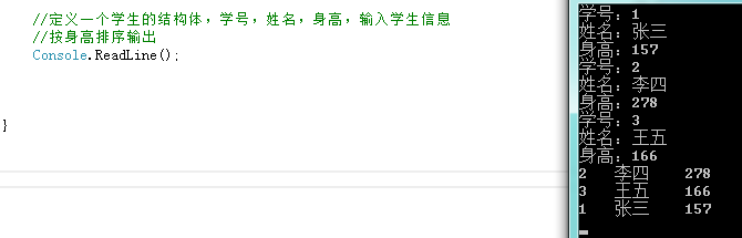 using System; using System.Collections; using System.Collections.Generic; using System.Linq; using System.Text; using System.Threading.Tasks; namespace ConsoleApplication1 { class Program {//定义一个学生的结构体,学号,姓名,身高,输入学生信息