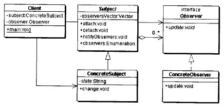 如果仔细考察主题功能的对象的功能时,可以发现它必须使用一个java集合来维护一个对所有的观察者对象的引用。而在前面所给出的实现里面,管理这个集合的方法是由抽象主题角色声明并由具体主题角色实现的。这才导致了类图中从具体主题角色到抽象观察者角色的连线。