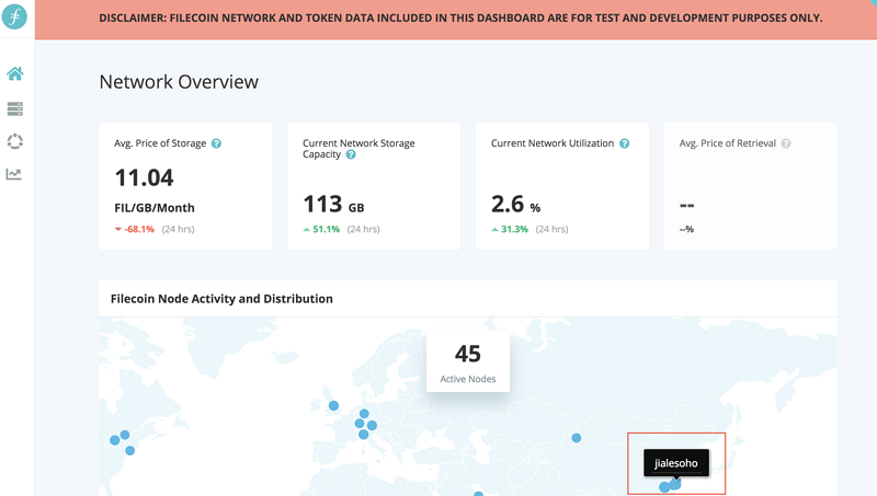 如图所示,刚刚我们自定义命名的Filecoin节点——jialesoho,已经被点亮在Filecoin的全网可视化监控面板中,除此之外,可视化控制台还有许多全网的交易数据,吞吐量,区块信息可供我们查阅和分析...