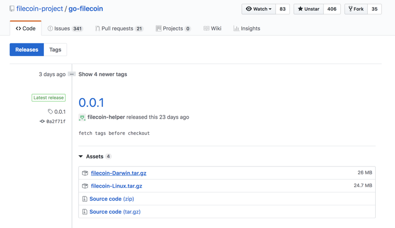 如上图所示,可以在https://github.com/filecoin-project/go-filecoin/releases中直接下载官方于2019年2月11日发布的0.0.1版本,将安装包解压至{$gopath}/bin目录下。