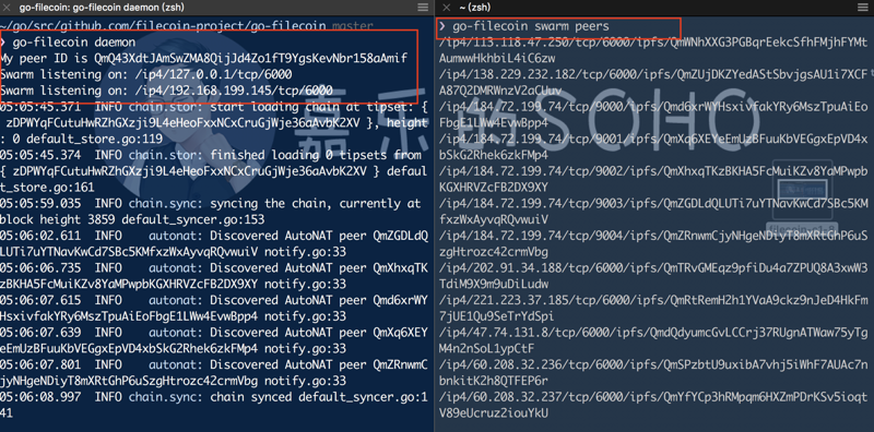 Filecoin发现节点的过程是遵循着gossip协议,逐渐向外发散,我们可以通过go-filecoin swarm peers 来查看所连接对等方的信息和过程。