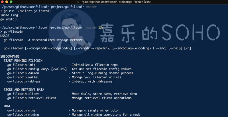 经过1.2节操作后,全局运行go-filecoin -help,出现如下图菜单栏,说明节点已经成功安装。
