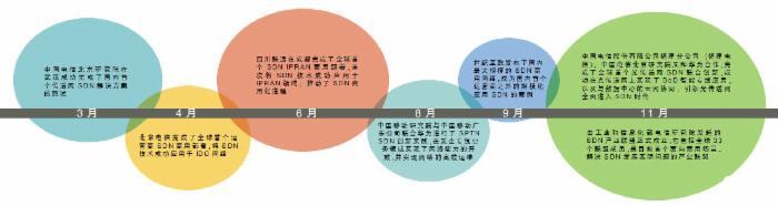 3月,中国电信北京研究院在武汉成功完成了国内首个传送网SDN解决方案的测试。4月,北京电信完成了全球首个运营商SDN商用部署,将SDN技术成功应用于IDC网络。6月,四川联通在成都完成了全球首个SDN IPRAN商用部署,首次将SDN技术成功应用于IPRAN领域,推动了SDN商用化进程。8月,中国移动研究院与中国移动广东公司联合华为进行了SPTN SDN创新实践,在政企专线业务领域实现了网络能力的开放,并实现网络的高效运维。11月,中国电信股份有限公司福建分公司(福建电信)、中国电信北京研究院又和华为合作,完成了全球首个光传送网SDN联合创新,成功在光传送网上实现了BoD智能专线应用,以及与数据中心的云网协同,引领光传送网全面进入SDN时代。