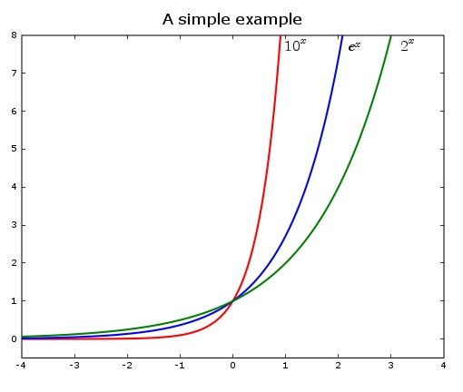 from matplotlib.matlab import * x = linspace(-4, 4, 200) f1 = power(10, x) f2 = power(e, x) f3 = power(2, x) plot(x, f1, 'r', x, f2, 'b', x, f3, 'g', linewidth=2) axis([-4, 4, -0.5, 8]) text(1, 7.5, r'$10^x$', fontsize=16) text(2.2, 7.5, r'$e^x$', fontsize=16) text(3.2, 7.5, r'$2^x$', fonsize=16) title('A simple example', fontsize=16) savefig('asd.png', dpi=75) show()