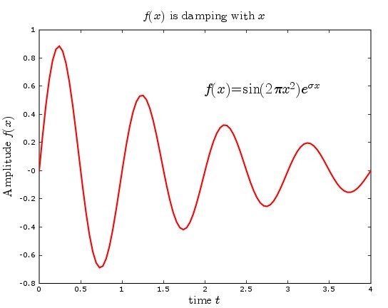 from matplotlib.matlab import * def f(x, c): m1 = sin(2*pi*x) m2 = exp(-c*x) return multiply(m1, m2) x = linspace(0, 4, 100) sigma = 0.5 plot(x, f(x, sigma), 'r', linewidth=2) xlabel(r'$\rm{time} \ t$', fontsize=16) ylabel(r'$\rm{Amplitude} \ f(x)$', fontsize=16) title(r'$f(x) \ \rm{is \ damping \ with} \ x$', fontsize=16) text(2.0, 0.5, r'$f(x) = \rm{sin}(2 \pi x^2) e^{\sigma x}$', fontsize=20) savefig('latex.png', dpi=75) show()