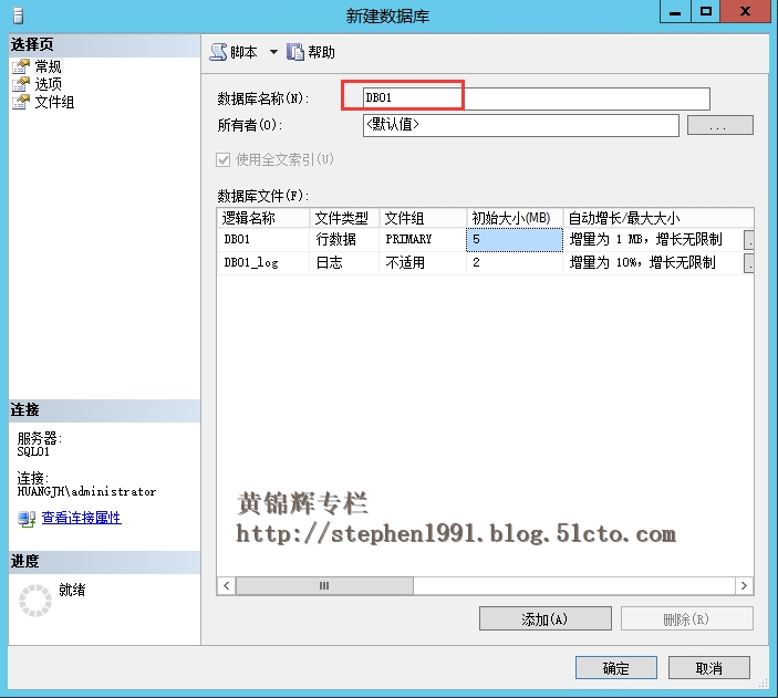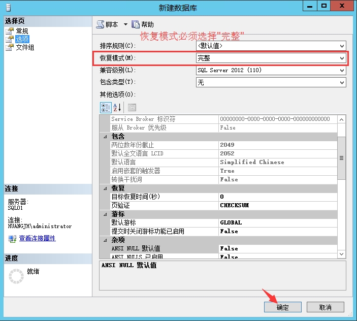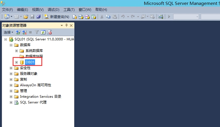 7. 新建数据库 7.1 在SQL01服务器打开SQL Studio连接至SQL01,右键选择”新建数据库” 7.2 输入数据库名称 7.3 在“选项”页面,选择恢复模式为”完整”,点击“确定” 7.4 数据库创建完如下图: 7.5 右键”DB01”—“任务“—”备份“ 7.6 点击”确定“ 7.7 点击”确定“