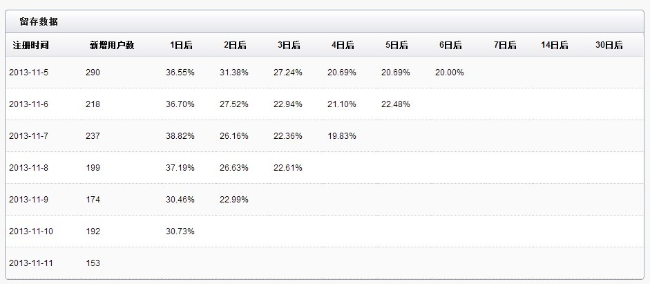 | 三十日留存数 | 首次登陆后第三十天登录过游戏的用户/统计日的注册用户数 |