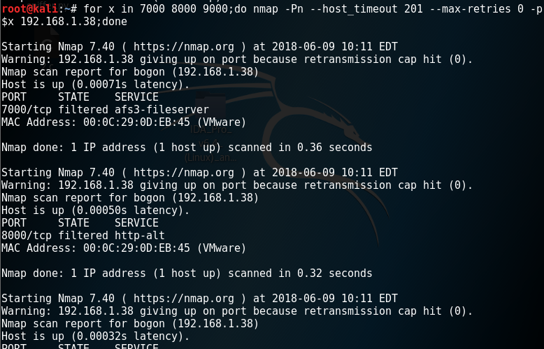 #for x in 7000 8000 9000; do nmap -Pn --host_timeout 201 --max-retries 0 -p $x 192.168.1.38; done