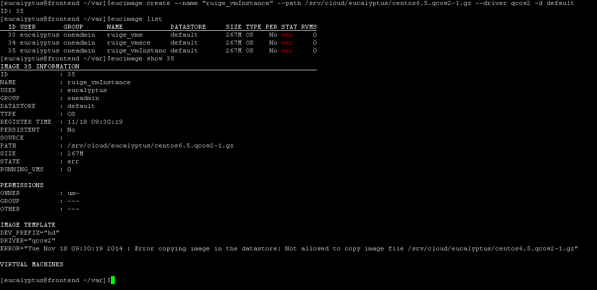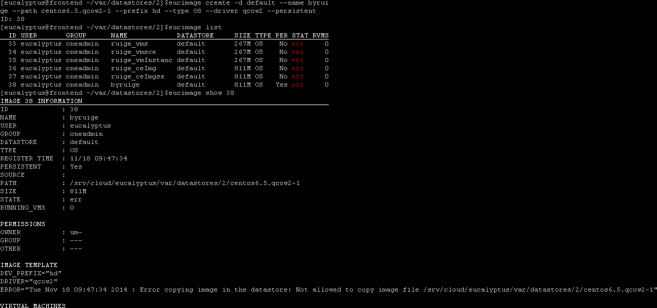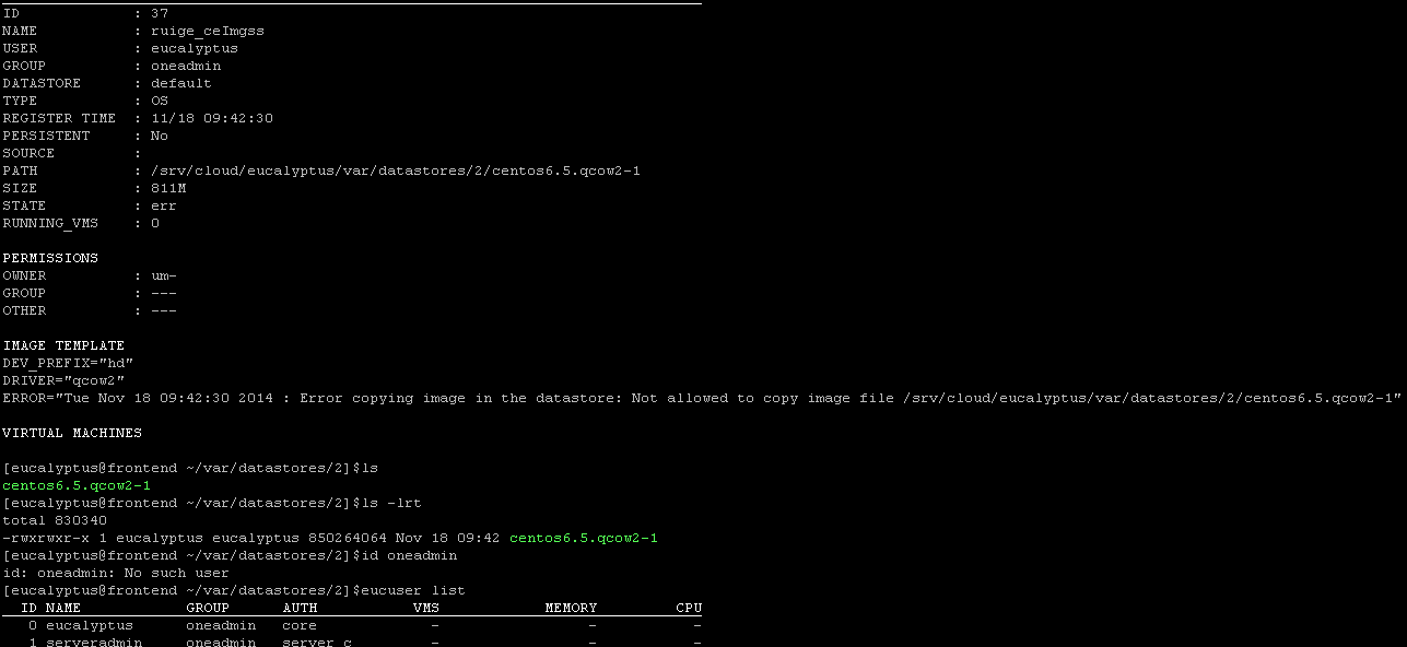 ERROR="Tue Nov 18 10:36:30 2014 : Error executing image transfer script: Error copying frontend:/srv/cloud/eucalyptus/var/datastores/1/f2c64d8675b4fd1619652ed11f410f57 to ruige.cc:/srv/cloud/eucalyptus/var//datastores/0/12/disk.0"