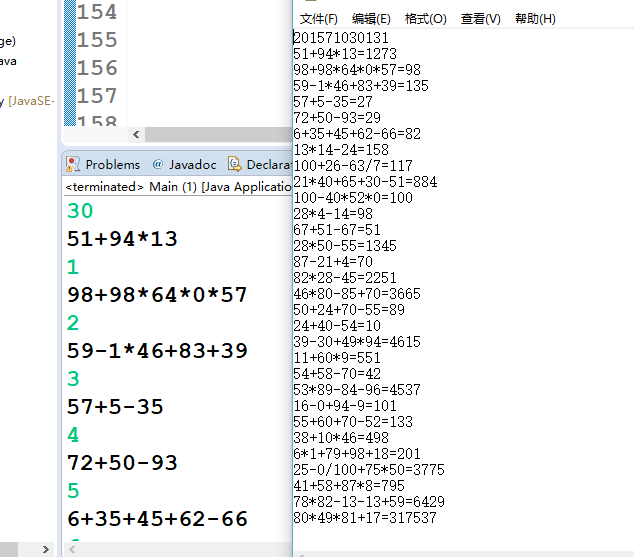 int a=(int)(Math.random()*100);//随机生成一个1-100的整数 int b=(int)(Math.random()*100);//随机生成一个1-100的整数 int c=(int)(Math.random()*100);//随机生成一个1-100的整数 int d=(int)(Math.random()*4);//随机生成一个1-4的整数,0表示加法,1表示减法,2表示乘法,3表示除法 String temp; switch((int)(Math.random()*3)) { case 0: if(d==0) System.out.println(a+"+"+b+"+"+c+"="); temp=Integer.toString(a)+"+"+Integer.toString(b)+"+"+Integer.toString(c)+"="+Integer.toString(a+b+c); fos.write(temp.getBytes()); if(d==1) System.out.println(a+"+"+b+"-"+c+"="); temp=Integer.toString(a)+"+"+Integer.toString(b)+"-"+Integer.toString(c)+"="+Integer.toString(a+b-c); fos.write(temp.getBytes()); if(d==2) System.out.println(a+"+"+b+"*"+c+"="); temp=Integer.toString(a)+"+"+Integer.toString(b)+"*"+Integer.toString(c)+"="+Integer.toString(a+b*c); fos.write(temp.getBytes()); if(d==3) System.out.println(a+"+"+b+"/"+c+"="); temp=Integer.toString(a)+"+"+Integer.toString(b)+"/"+Integer.toString(c)+"="+Integer.toString(a+b/c); fos.write(temp.getBytes()); int sum = in.nextInt(); count++; break; case 1: if(d==0) System.out.println(a+"-"+b+"+"+c+"="); temp=Integer.toString(a)+"-"+Integer.toString(b)+"+"+Integer.toString(c)+"="+Integer.toString(a-b+c); fos.write(temp.getBytes()); if(d==1) System.out.println(a+"-"+b+"-"+c+"="); temp=Integer.toString(a)+"-"+Integer.toString(b)+"-"+Integer.toString(c)+"="+Integer.toString(a-b-c); fos.write(temp.getBytes()); if(d==2) System.out.println(a+"-"+b+"*"+c+"=");