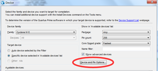 Quartus II中依次点击【Assigments】-> 【Device】,在弹出的界面中选择"Device and Pin Options"