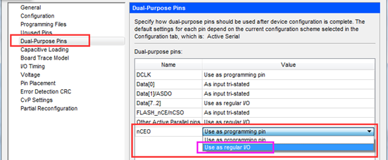 在弹出的选项卡中,选择Dual-Purpose Pins,在右侧双击nCEO的值,在弹出的下拉选项中选择Use as regular I/O即可。