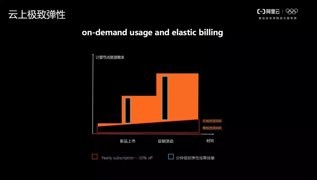 比如客户在3、4月有新品上市,5月还有促销活动,这两个时期计算需求会非常大。如按照传统架构方式,可能需要在新品上市之前就将容量弹到更大的规模,并且保持这样的水位,到了后面的促销阶段又需要弹到更高的规格,成本非常高昂。但如果能够做到极致弹性,比如 POLARDB 的存储与计算分离,实现快速弹性扩容,那么用户就只需在蓝色方块出现之前将容量弹上去,之后再弹下来即可,这样就能大幅降低成本。