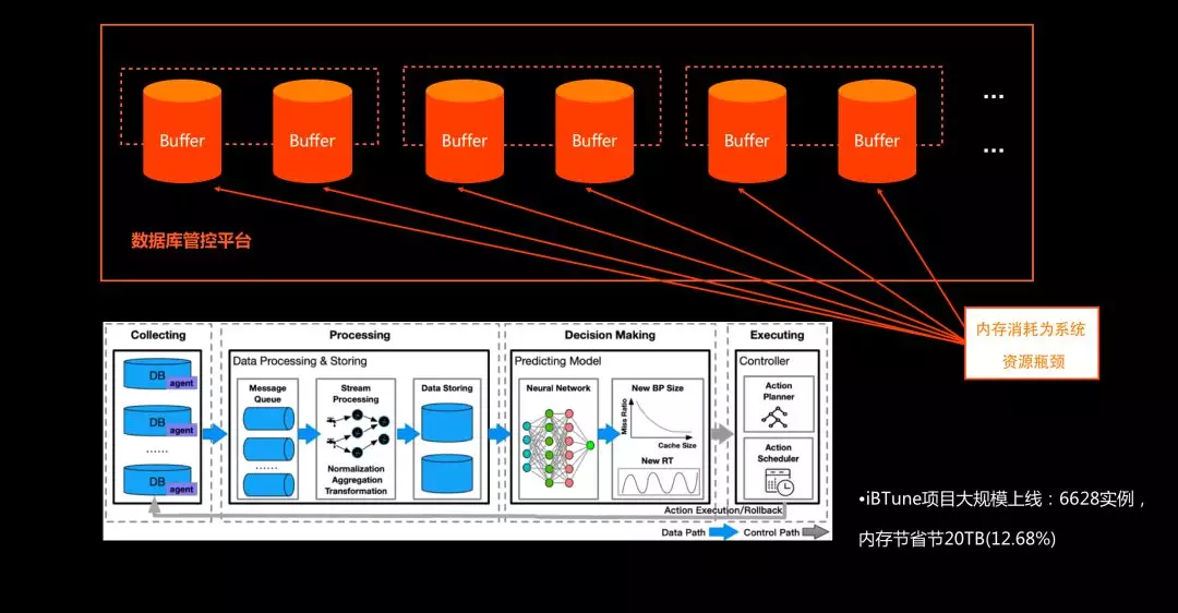 iBTune 的基本思想是,每个数据库实例都包含一个 Buffer Size,传统数据库里面的Buffer Size 是提前分配好的,不能变化。而在大型企业里,Buffer 是一个资源池,需要消耗内存,因此希望做到弹性自动调配每个实例里的 BufferSize。比如淘宝商品库的数据库实例晚上不需要那么大的 Buffer,那么就可以自动将其 Buffer Size 弹下来,到早上再自动弹上去,同时要求不影响其 RT。为了满足上述需求并进行自动Buffer 优化,阿里云数据库团队构建了 iBTune 系统,目前监控近 7000个数据库实例,通过长期运营,可平均节省20TB 内存。介绍 iBTune 项目的核心技术论文也发表在了今年的 VLDB 2019大会上。