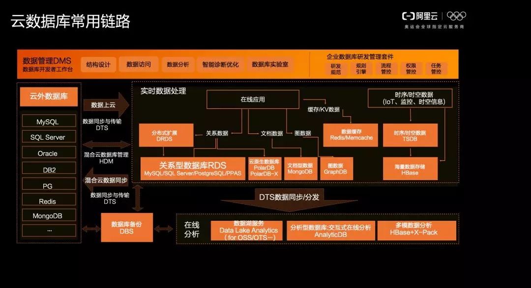 阿里云数据库按照工具产品、引擎产品以及运营管控的全程数据库产品分类提供服务。下图展现的是阿里云——云数据库常用链路,通过 DTS 工具将线下数据库迁移到线上,基于数据需求/分类,分发至关系型数据库、图数据库以及 AnalyticDB 等。