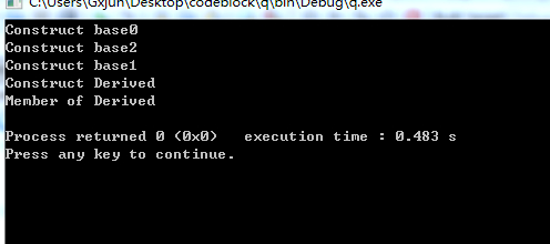 1 /*曾经有段时间一直被构造函数中的虚函数所困扰,现在通过自己重新学习了一遍,标注一下容易忘记的知识*/ 2 #include<iostream> 3 using namespace std; 4 class Base0 5 { 6 public: 7 Base0(int var):var0(var) 8 { 9 cout<<"Construct base0"<<endl; 10 } ; 11 int var0; 12 void fun() 13 { 14 cout<<"Menber of Base0"<<endl; 15 } 16 17 }; 18 class Base1 :virtual public Base0 19 { 20 public: 21 Base1(int var) :Base0(var) 22 { 23 cout<<"Construct base1"<<endl; 24 } 25 int var1 ; 26 }; 27 class Base2 : virtual public Base0 28 { 29 public : 30 Base2(int var): Base0(var) 31 { 32 cout<<"Construct base2"<<endl; 33 } 34 int var; 35 }; 36 class Derived : public Base2,public Base1 //构造函数的执行顺序与这儿有关 37 { 38 public : 39 Derived(int var) : Base2(var),Base1(var),Base0(var) 40 { 41 cout<<"Construct Derived"<<endl; 42 } 43 int var; 44 void fun() 45 { 46 cout<<"Member of Derived"<<endl; 47 } 48 }; 49 int main() 50 { 51 Derived d(1); 52 d.var=2; 53 d.fun(); 54 return 0; 55 }