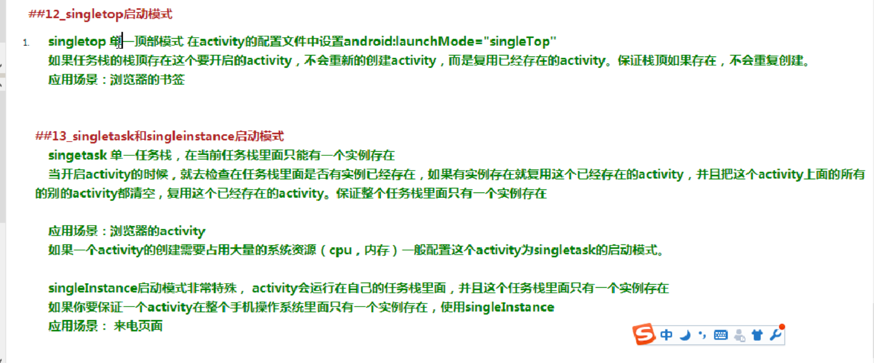 2.singleTop:会检查任务栈栈顶的activity,如果存在则不会创建,直接复用。