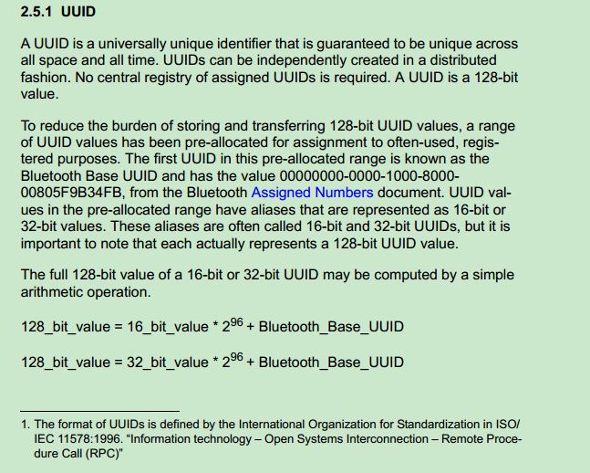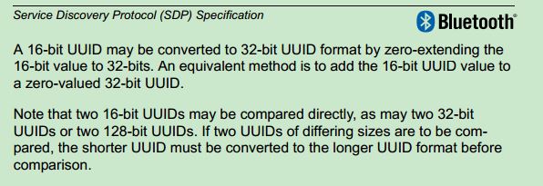 若32 bit UUID为xxxxxxxx,那么128 bit UUID为xxxxxxxx-0000-1000-8000-00805F9B34FB
