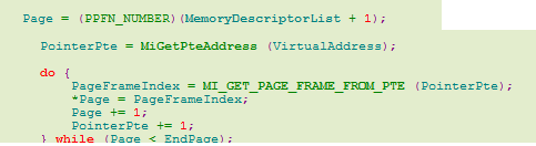 然后使用MmBuildMdlForNonPagedPool将pte中的页表项都放入mdl中的body部分。