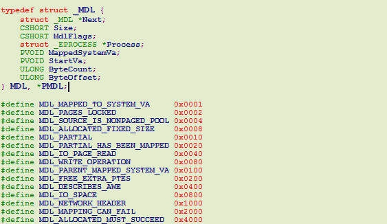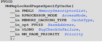 这样mdl结构整体的构建就结束了,开始使用mdl。使用MmMapLockedPagesSpecifyCache将MDL中存储的physical address page映射到虚拟地址中。
