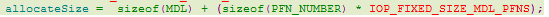其中PFN_NUMBER 为ULONG, IOP_FIXED_SIZE_MDL_PFNS代表pte的个数。 -
