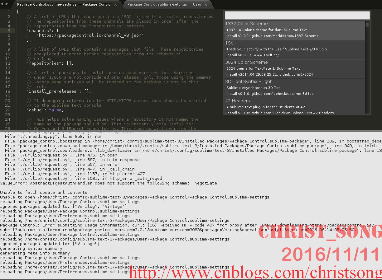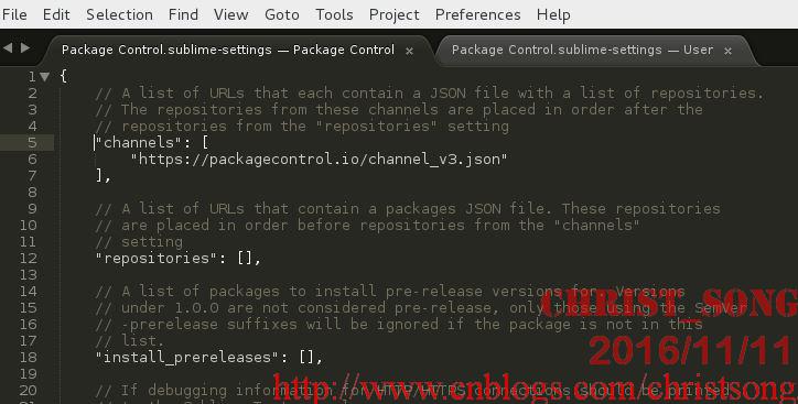 之前一直是在windows上使用sublime,由于公司内部搭建了服务器,干脆把所有项目搬到了服务器上,自然也装上了牛逼闪闪的sublime,然而在接下来安装插件的时候却出了问题,package control一直弹出There are no packages available for installation,由于公司的网络也比较操蛋,防火墙等级太高,所有的出口网络都要输入自己的账号密码,所以一直以为是这块的问题,各种尝试无果之后,偶然看了一下控制台打印的信息,发现是http://packagecontrol.io/channel_v3.json这个文件获取失败,看这名字应该是个package列表吧,貌似在哪里见过。打开package setting一看,果然,第一项就是