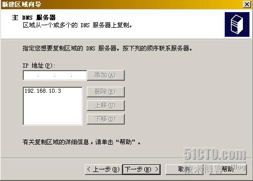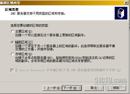 在DC1上打开DNS,开始-运行里输入dnsmgmt.msc,新建区域-辅助区域