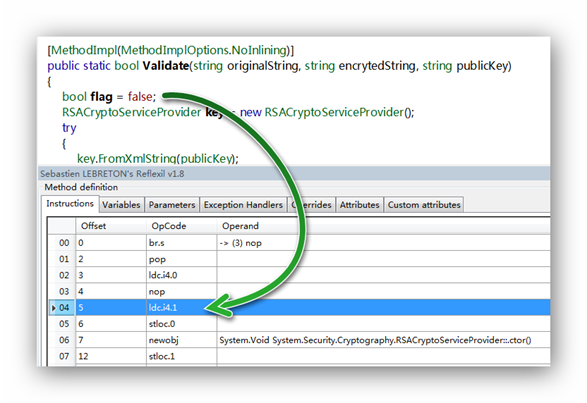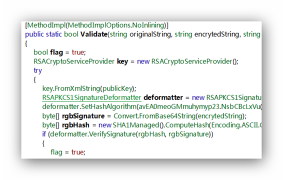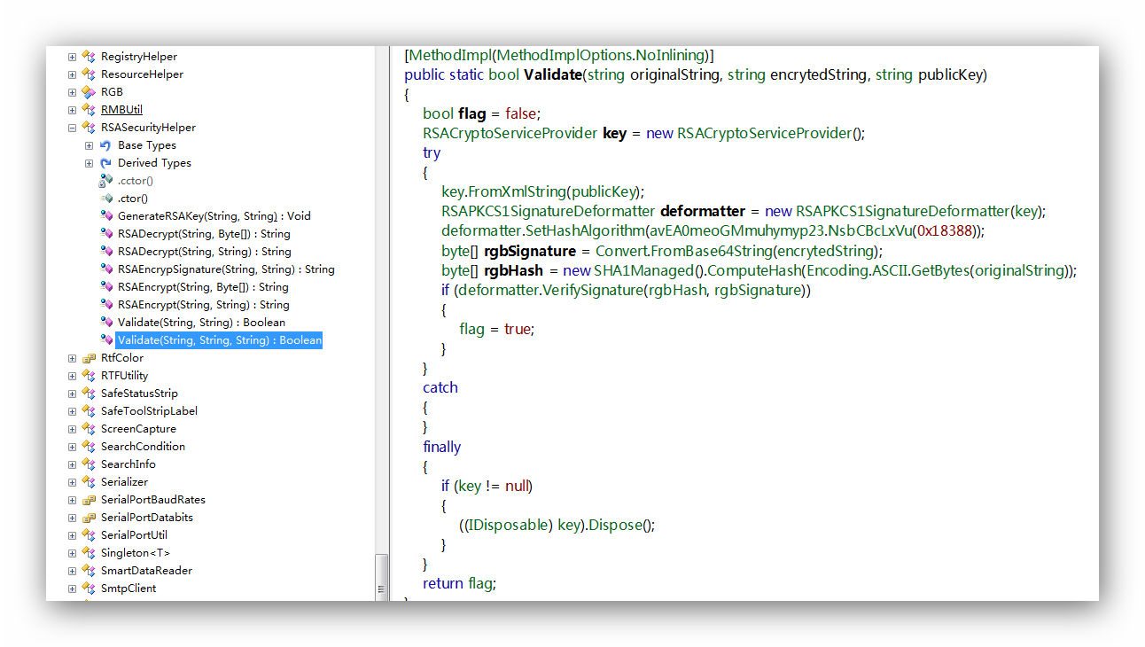 第三步,一层一层剥开,我们进入了RSASecurityHelper类的Validate验证方法。显然,我们要让结果返回为true才行。