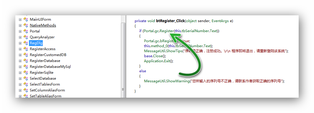 第二步,直接进入注册窗口的注册按键事件,可以看到关键这处在于这个判断,如果我们直接修改判断不一定会成功,能深究则深究!