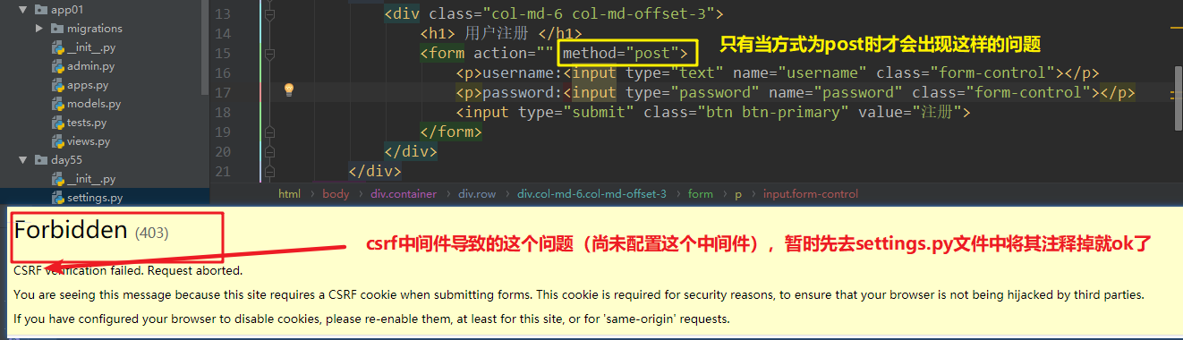(2) 注册 逻辑与登录类似,只是在返回页面的时候改成reg.html 1> 用户打开注册页面,服务端返回一个reg.html页面 2> 用户提交注册信息,服务端处理注册操作,返回相应结果 3> templates文件夹中同样得有reg.html文件 ps: <1>当将form表单的提交方式改为post时,由于未配置csrf中间件,会报403错误 此时只要将settings.py文件中的MIDDLEWARE列表中的csrf注释掉就行 <2> 注册提交的数据格式: <QueryDict: {'username': ['lisi'], 'password': ['123']}> 通常取值方式有: 1> 通过request.POST.get(key) 取值 --> 取出单个的元素 2> 通过request.POST['password'] 取值 --> 不推荐,会报错 通过get方法去除的值是单个的(列表最后一个元素),如果列表中的数据为多个值的时候; 通过使用 getlist 方法,便可以取出列表中所有的值,常用于:多选框 <3> 获取get请求的数据,与操作post一毛一样!!