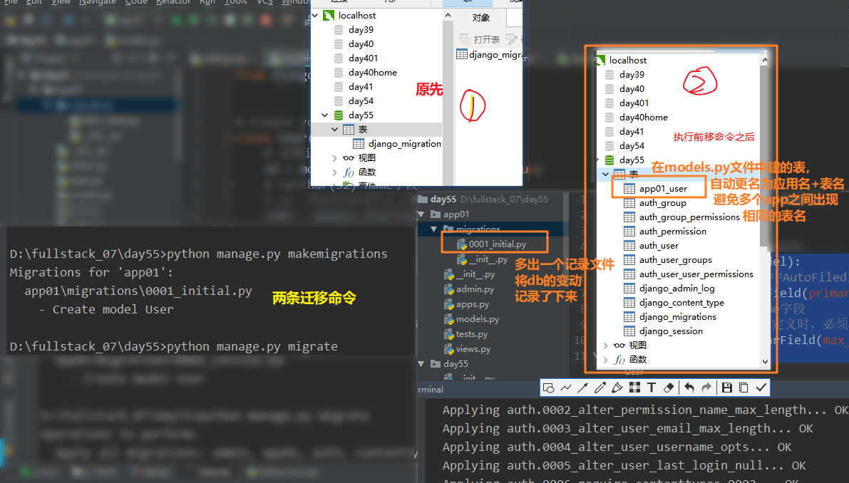 2.2.1 修改Django数据库模块 <1> 首先先去settings.py中,修改DATA_BASES 字典文件 'ENGINE': 'django.db.backends.mysql', 'NAME': 'day55', 'HOST': '127.0.0.1', 'PORT': 3306, 'USER': 'root', 'PASSWORD': '123456', 修改engine,name,host,port,user,password这些内容,且key都为大写 <2> 修改__init__.py文件,告诉Django使用pymysql(替换默认的mysql_db模块) (mysql_db模块性能不OK) 方式一:在项目文件夹下面的__init__.py文件中修改 方式二:在应用文件夹下面的__init__.py文件中修改 代码: import pymysql pymysql.install_as_MySQLdb()