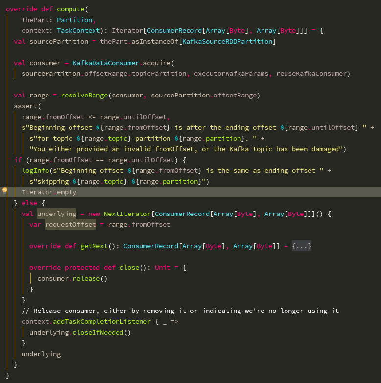我们在compute方法中看到,在下面的else分支里,当任务完成是,会回调迭代器的closeIfNeed方法,底层会调用到KafkaDataConsumer.release方法,针对被缓存的KafkaDataConsumer,将其状态标记位可被使用的状态,而针对不被缓存的KafkaDataConsumer,直接调用其close方法。这个逻辑在compute方法的else分支里是没有问题的。