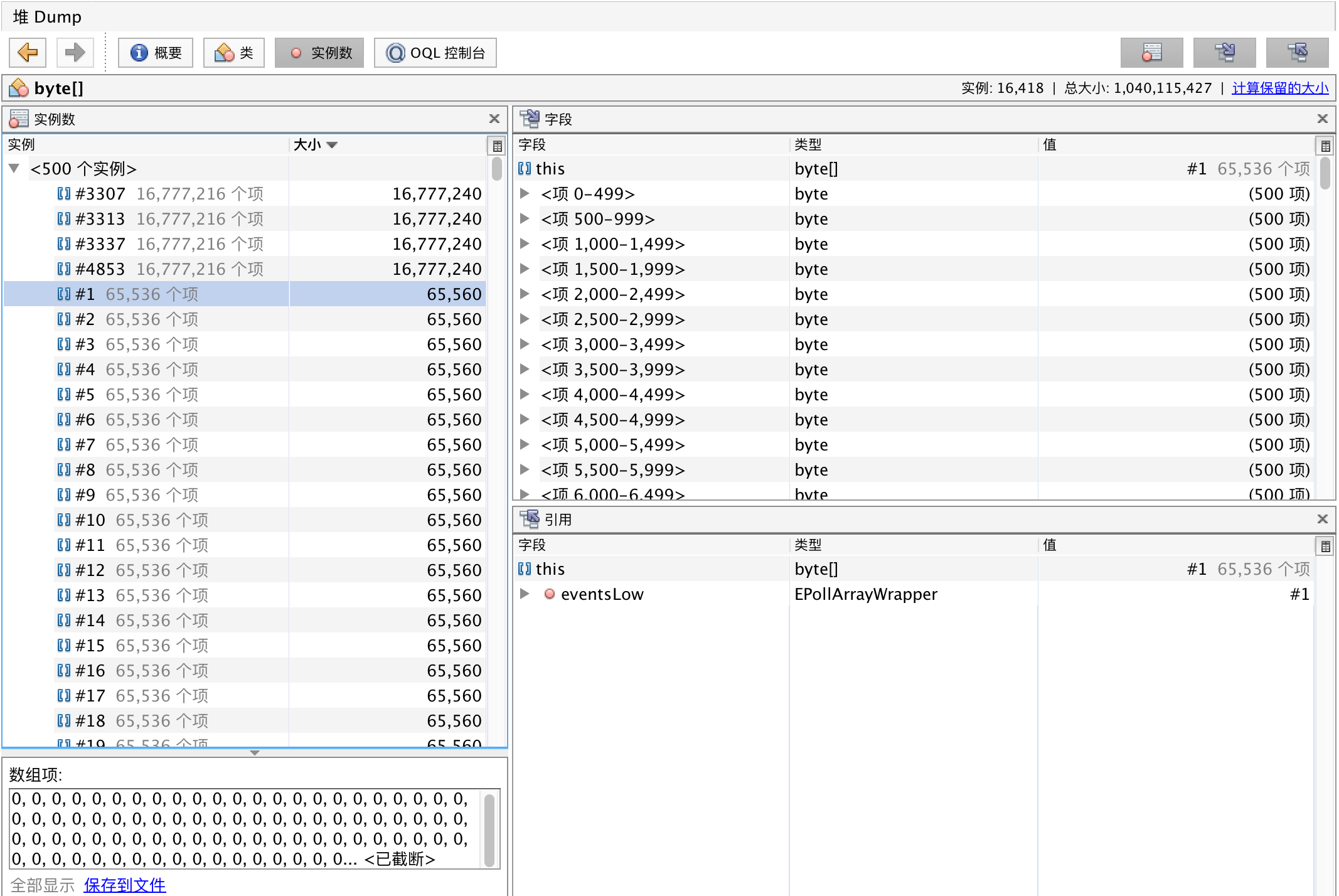 发现除了绝大多数的字节数组都是65560长度,且内容全为0,而且在右下侧的窗口里发现引用这些字节数组的类都是EPollArrayWrapper类,经过查找发现存在如下类型的类,其数量均为14823,
