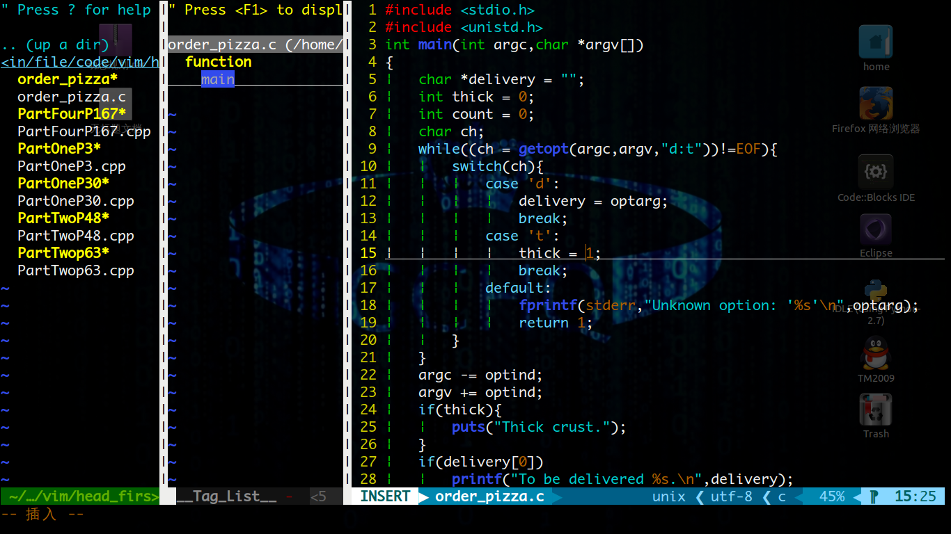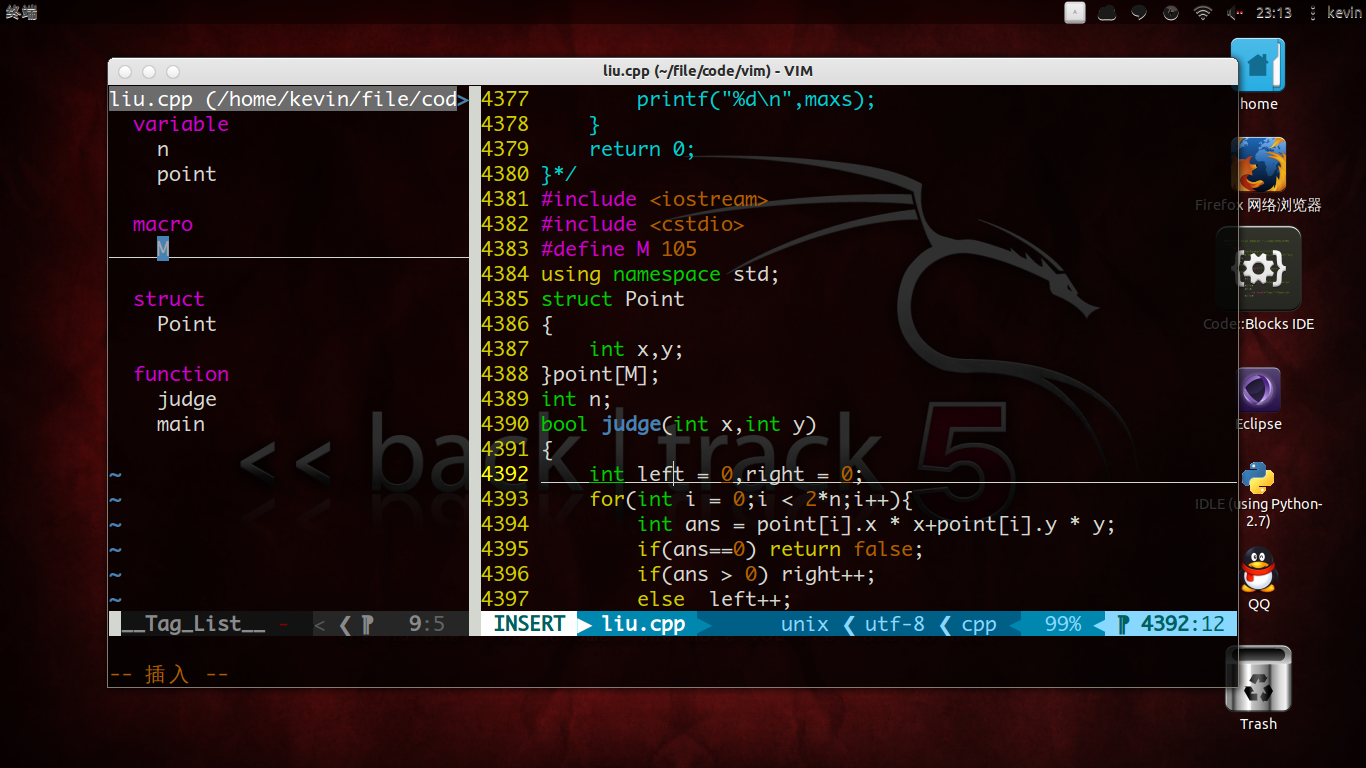 1 call pathogen#infect() 2 """"""""""""""""""""""""""""""""""""""""""""""""""""""""""""""""""""" 3 " 一般设定 4 """"""""""""""""""""""""""""""""""""""""""""""""""""""""""""""""""""" 5 " 显示中文帮助 6 source ~/.vim/macros/gdb_mappings.vim 7 "nmap <S-F7> :call SToggleGDB()<cr> 8 "nmap <F7> :call <SID>Toggle()<CR> 9 if version >= 603 10 11 set helplang=cn 12 13 set encoding=utf-8 14 15 endif 16 colorscheme slate 17 set guifont=Courier_New:h10:cANSI 18 " 设定默认解码 19 set fenc=utf-8 20 set fencs=utf-8,usc-bom,euc-jp,gb18030,gbk,gb2312,cp936 21 22 " 不要使用vi的键盘模式,而是vim自己的 23 set nocompatible 24 25 " history文件中需要记录的行数 26 set history=100 27 28 " 在处理未保存或只读文件的时候,弹出确认 29 set confirm 30 31 " 与windows共享剪贴板 32 set clipboard+=unnamed 33 34 " 侦测文件类型 35 filetype on 36 37 set cursorline " 突出显示当前行 38 39 " 载入文件类型插件 40 filetype plugin indent on 41 set completeopt=longest,menu 42 set nocp 43 filetype plugin on 44 45 " 为特定文件类型载入相关缩进文件 46 filetype indent on 47 48 " 保存全局变量 49 set viminfo+=! 50 51 " 带有如下符号的单词不要被换行分割 52 set iskeyword+=_,$,@,%,#,- 53 54 " 语法高亮 55 syntax on 56 57 " 高亮字符,让其不受100列限制 58 :highlight OverLength ctermbg=red ctermfg=white guibg=red guifg=white 59 :match OverLength '\%101v.*' 60 61 " 状态行颜色 62 highlight StatusLine guifg=SlateBlue guibg=Yellow 63 highlight StatusLineNC guifg=SlateBlue guibg=White 64 65 66 " 映射全选+复制 ctrl+a 67 map <C-A> ggVGY 68 map! <C-A> <Esc>ggVGY 69 map <F12> gg=G 70 " 选中状态下 Ctrl+c 复制 71 vmap <C-c> "+y 72 73 74 """""""""""""""""""""""""""""""""""""""""""""""""""""""""""""""""""""""""""""""""""""""""""""""""""" 75 " 文件设置 76 """"""""""""""""""""""""""""""""""""""""""""""""""""""""""""""""""""" 77 " 不要备份文件(根据自己需要取舍) 78 set nobackup 79 80 " 不要生成swap文件,当buffer被丢弃的时候隐藏它 81 setlocal noswapfile 82 set bufhidden=hide 83 84 " 字符间插入的像素行数目 85 set linespace=0 86 87 " 增强模式中的命令行自动完成操作 88 set wildmenu 89 90 " 在状态行上显示光标所在位置的行号和列号 91 set ruler 92 set rulerformat=%20(%2*%<%f%=\ %m%r\ %3l\ %c\ %p%%%) 93 94 " 命令行(在状态行下)的高度,默认为1,这里是2 95 set cmdheight=2 96 97 " 使回格键(backspace)正常处理indent, eol, start等 98 set backspace=2 99 100 " 允许backspace和光标键跨越行边界 101 set whichwrap+=<,>,h,l 102 103 " 可以在buffer的任何地方使用鼠标(类似office中在工作区双击鼠标定位) 104 set mouse=a 105 set selection=exclusive 106 set selectmode=mouse,key 107 108 "自动添加作者信息 109 map <F4> ms:call TitleDet()<cr>'s 110 111 function AddTitle() 112 call append(0,"/*======================================================================") 113 call append(1," * Author : kevin") 114 call append(2," * Filename : ".expand("%d:t")) 115 call append(3," * Creat time : ".strftime("%Y-%m-%d %H:%M")) 116 call append(4," * Description :") 117 call append(5,"========================================================================*/") 118 call append( 6,"#include <iostream>") 119 call append( 7,"#include <algorithm>") 120 call append( 8,"#include <cstdio>") 121 call append( 9,"#include <cstring>") 122 call append(10,"#include <queue>") 123 call append(11,"#include <cmath>") 124 call append(12,"#define M ") 125 call append(13,"using namespace std;") 126 call append(14,"int main(int argc,char *argv[])") 127 call append(15,"{") 128 call append(16," return 0;") 129 call append(17,"}") 130 131 echohl WarningMsg | echo "Successful in adding the copyright." | echohl None 132 133 endf 134 135 "更新最近修改时间和文件名 136 137 normal m' 138 139 "execute '/# *Last modified:/s@:.*$@\=strftime(":\t%Y-%m-%d %H:%M")@' 140 141 normal " 142 143 normal mk 144 145 "execute '/# *Filename:/s@:.*$@\=":\t\t".expand("%:t")@' 146 147 execute "noh" 148 149 normal 'k 150 151 "echohl WarningMsg | echo "\n" | echo "Successful in updating the copy right."| echohl None 152 153 "endfunction 154 155 156 157 "判断前10行代码里面,是否有Last modified这个单词, 158 159 "如果没有的话,代表没有添加过作者信息,需要新添加; 160 161 "如果有的话,那么只需要更新即可 162 163 function TitleDet() 164 165 let n=1 166 167 while n < 10 168 169 let line = getline(n) 170 171 if line =~'^\#\s*\S*Last\smodified:\S*.*$' 172 173 call UpdateTitle() 174 175 return 176 177 endif 178 179 let n = n + 1 180 181 endwhile 182 183 call AddTitle() 184 185 endfunction 186 187 188 " 设置NerdTree 189 map <F3> :NERDTreeMirror<CR> 190 map <F3> :NERDTreeToggle<CR> 191 192 set tags=/home/kevin/file/tags 193 194 "list{ 195 let Tlist_Auto_Open = 1 196 let Tlist_Show_One_File = 1 197 let Tlist_Use_Right_Window = 0 198 let Tlist_Exit_OnlyWindow = 1 199 let Tlist_GainFocus_On_ToggleOpen = 1 200 let Tlist_Ctags_Cmd='/usr/bin/ctags' 201 map <F2> :Tlist<CR> 202 "} 203 204 205 206 " 启动的时候不显示那个援助索马里儿童的提示 207 set shortmess=atI 208 209 " 通过使用: commands命令,告诉我们文件的哪一行被改变过 210 set report=0 211 212 " 不让vim发出讨厌的滴滴声 213 set noerrorbells 214 215 " 在被分割的窗口间显示空白,便于阅读 216 "set fillchars=vert:\ ,stl:\ ,stlnc:\ 217 "set fillchars=vert:| ,stl:| ,stlnc:| 218 219 """"""""""""""""""""""""""""""""""""""""""""""""""""""""""""""""""""" 220 " 搜索和匹配 221 """"""""""""""""""""""""""""""""""""""""""""""""""""""""""""""""""""" 222 " 高亮显示匹配的括号 223 set showmatch 224 225 " 匹配括号高亮的时间(单位是十分之一秒) 226 set matchtime=5 227 228 " 在搜索的时候忽略大小写 229 set ignorecase 230 231 " 不要高亮被搜索的句子(phrases) 232 set nohlsearch 233 234 "代码补