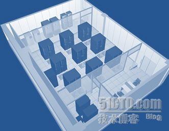 (下图是个典型的小型机房功能区俯瞰图。它包含了制冷区,服务器区,存储设备区,以及机房人员管理区。整个机房同时有门禁系统把控。)