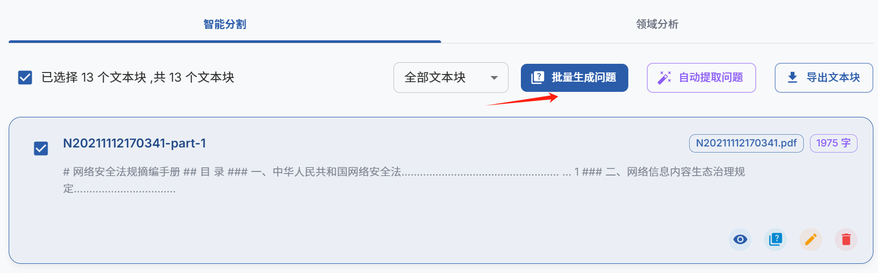 可以全部选择拆分后的文本,然后批量生成问题,如下图。