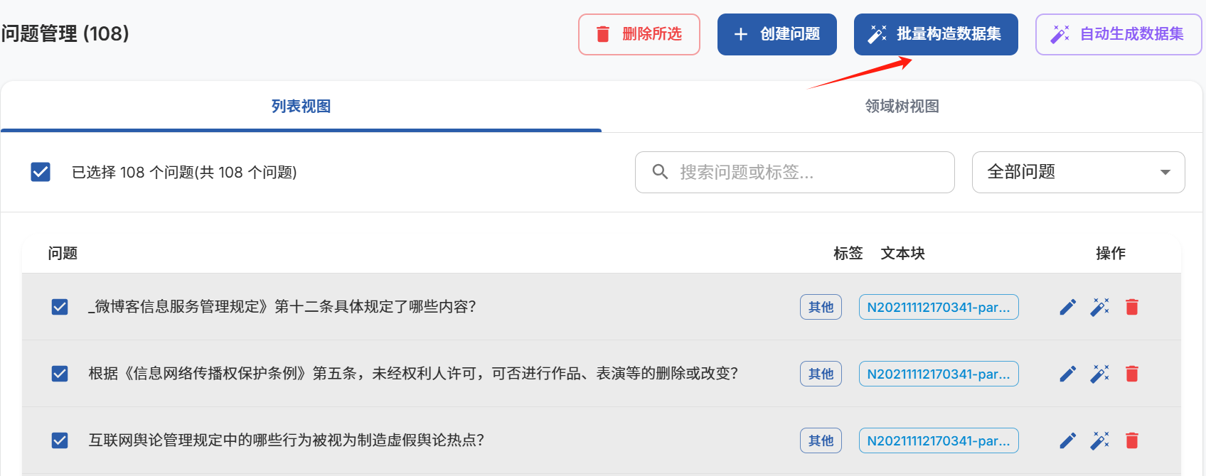 选择“问题管理”,勾选生成的问题,选择“批量构造数据集”,过程仍需等待一段时间。