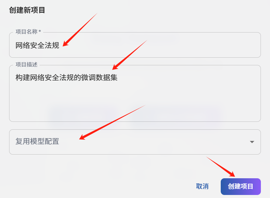 创建项目“网络安全法规”,本文以生成法律法规的领域数据为例。如图所示。