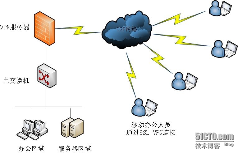移动办公用户SSL ×××网络一般如下所示,有很多移动办公人员需要不间断的连接到总部访问应用服务器。