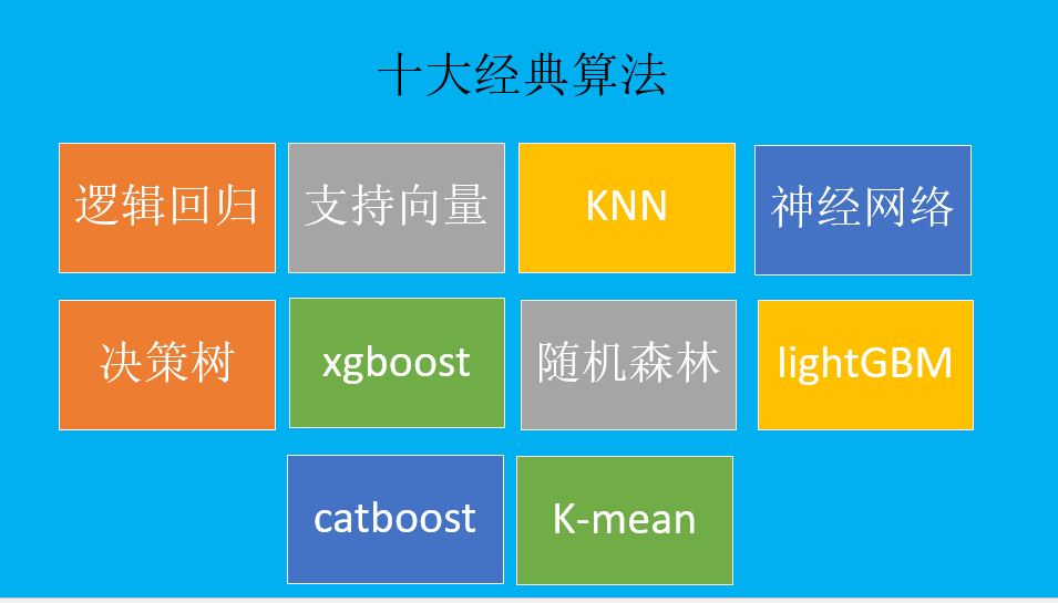 课程中十大经典机器学习算法震撼登场:逻辑回归,支持向量,KNN,神经网络,随机森林,xgboost,lightGBM,catboost。课程提供视频里讲解脚本,这些模型脚本可以应用于各个领域数据,包括金融反欺诈模型,信用评分模型,收入预测模型等等,为中小企业提供现成解决方案。