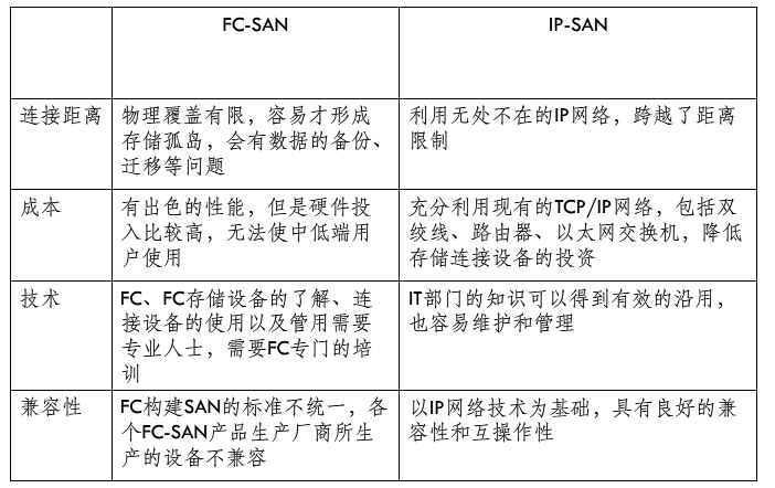 实现SAN有2种方式:一是称为FC-SAN,通过光钎交换机来实现SAN系统;另一种称为IP-SAN,通过现有的IP网络来实现SAN系统。