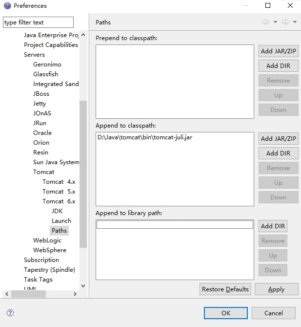 3、然后在右侧的窗体中找到Append to classpath,点击"Add JAR/ZIP",找到Tomca安装路径下的bin目录中tomcat-juli.jar,点击apply和ok,完成设置