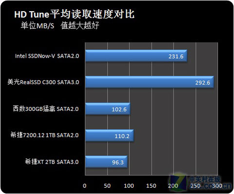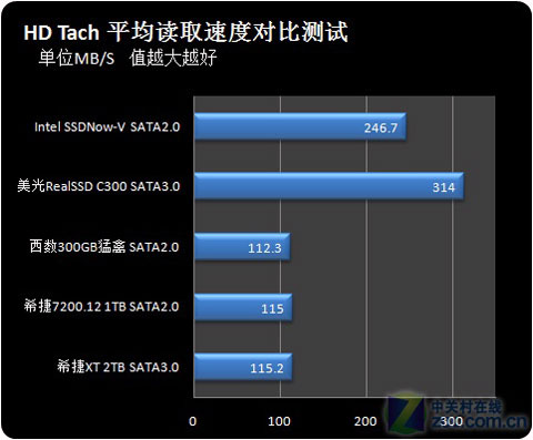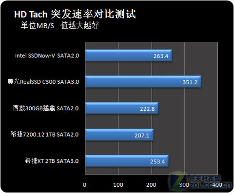 其实不然,从评测数据上看,SSD硬盘在搭载SATA3.0接口后,无论是平均读取速度还是突发速率,都有了长足的进步。拿美光C300固态硬盘为例,在HD Tach测试中,速度均已经达到SATA2.0的峰值300MB/S,表现突出。而且相对于SATA2.0接口固态硬盘也有大幅提升,可见SATA3.0接口更适合SSD固态硬盘。