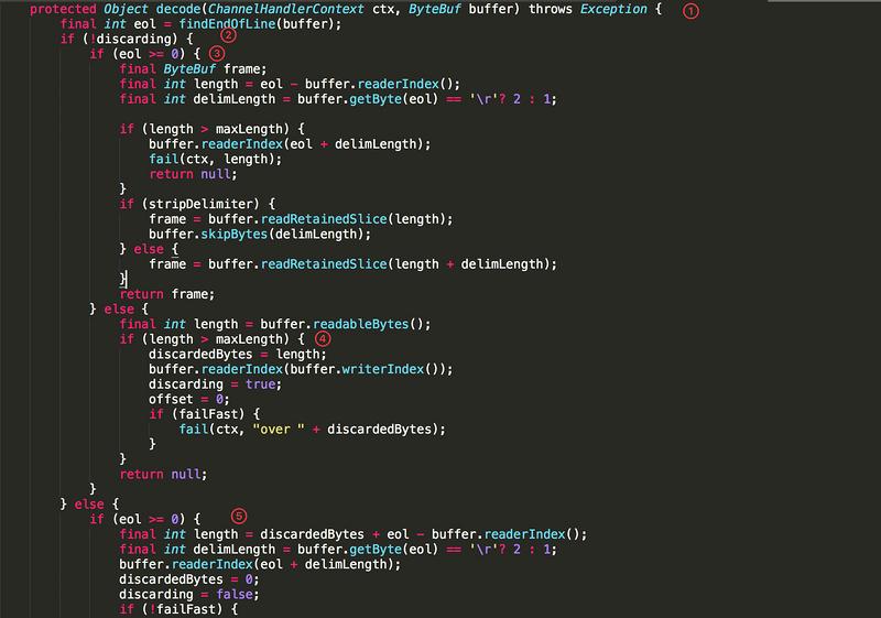 findEndOfLine方法去找到当前报文中是否存在分隔符,存在就会返回分隔符所在的位置。 - 判断是否需要丢弃,默认为 false ,第一次走这个逻辑(下文会判断是否需要改为 true)。