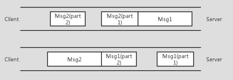 还有可能出现上面这样的虽然收到了两个包,但是里面的内容却是互相包含,对于应用来说依然无法解析(拆包)。