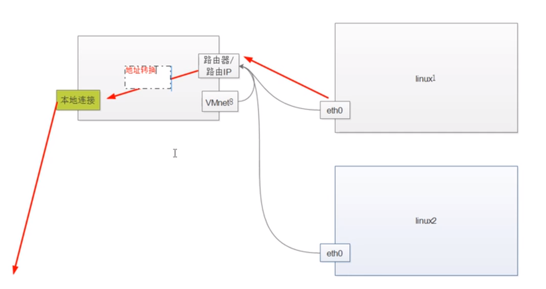 因为linux机器和虚拟路由器和VMnet8 所在的网段和 windows本地连接不在一个网段,linux机器请求外部数据的时候 通过 vmware软件 转换了地址,以求能够请求到外部数据