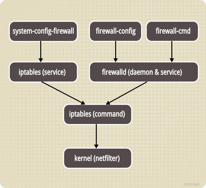 在RHEL7里有几种防火墙共存:FirewallD、iptables、ebtables,默认是使用FirewallD来管理netfilter子系统,不过底层调用的命令仍然是iptables等。