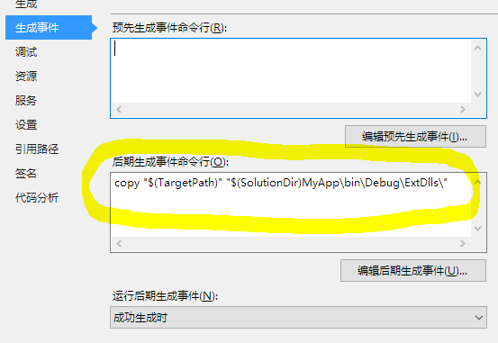copy "$(TargetPath)" "$(SolutionDir)MyApp\bin\Debug\ExtDlls\"