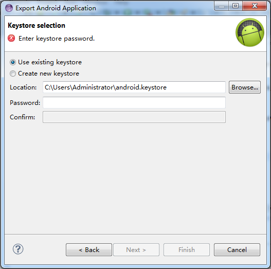 使用刚刚创建的keystore,location就是你的android.keystore的位置,password就是你自己设的密码,然后next-->Finish;这样你的apk就打包好了,直接就可以在你的android手机上跑了。