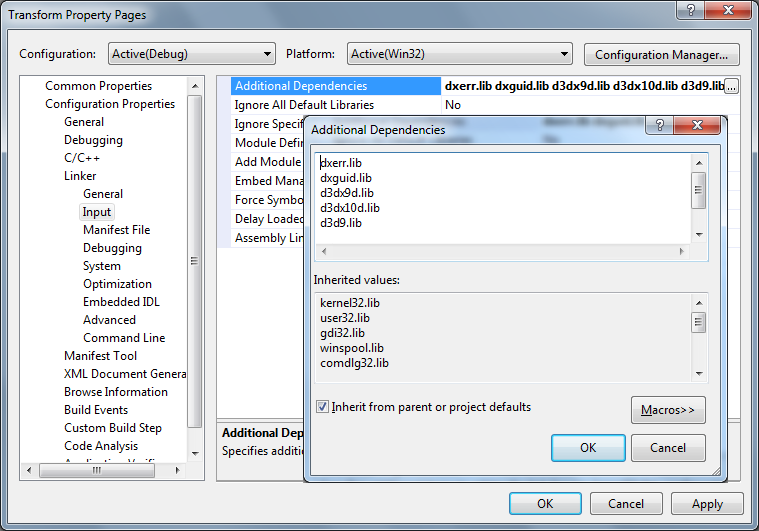 dxerr.lib dxguid.lib d3dx9d.lib d3dx10d.lib d3d9.lib winmm.lib comctl32.lib,多个文件之间以空格分离。